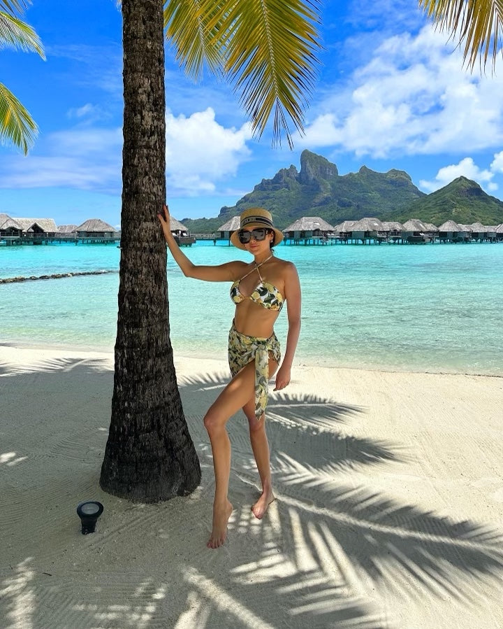 This was my search for dinner from our first night time in Bora Bora! This Cult Gaia costume is the proper trip costume! And, in fact, I wore my favourite Baroque Pearl Hoops from J. Brooks. They’re my favourite!